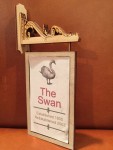 I am busy designing and making a miniature double sided hanging pub sign. The “Swan” piece of paper in the middle picture is only to get a visual of how it’s going to look. The sign is not finished yet. The scale is 1:12 (1 inch = 12 inches). Total hight is 6 3/4 inches x 3 1/8 inches width x 3/4 inches thick (at the hangar bracket).
