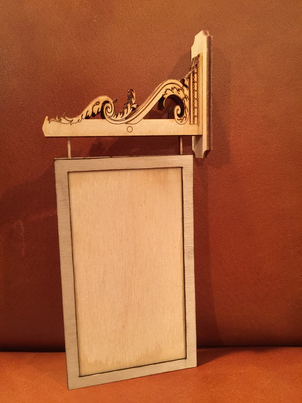 I am busy designing and making a miniature double sided hanging pub sign. The “Swan” piece of paper in the middle picture is only to get a visual of how it’s going to look. The sign is not finished yet. The scale is 1:12 (1 inch = 12 inches). Total hight is 6 3/4 inches x 3 1/8 inches width x 3/4 inches thick (at the hangar bracket).